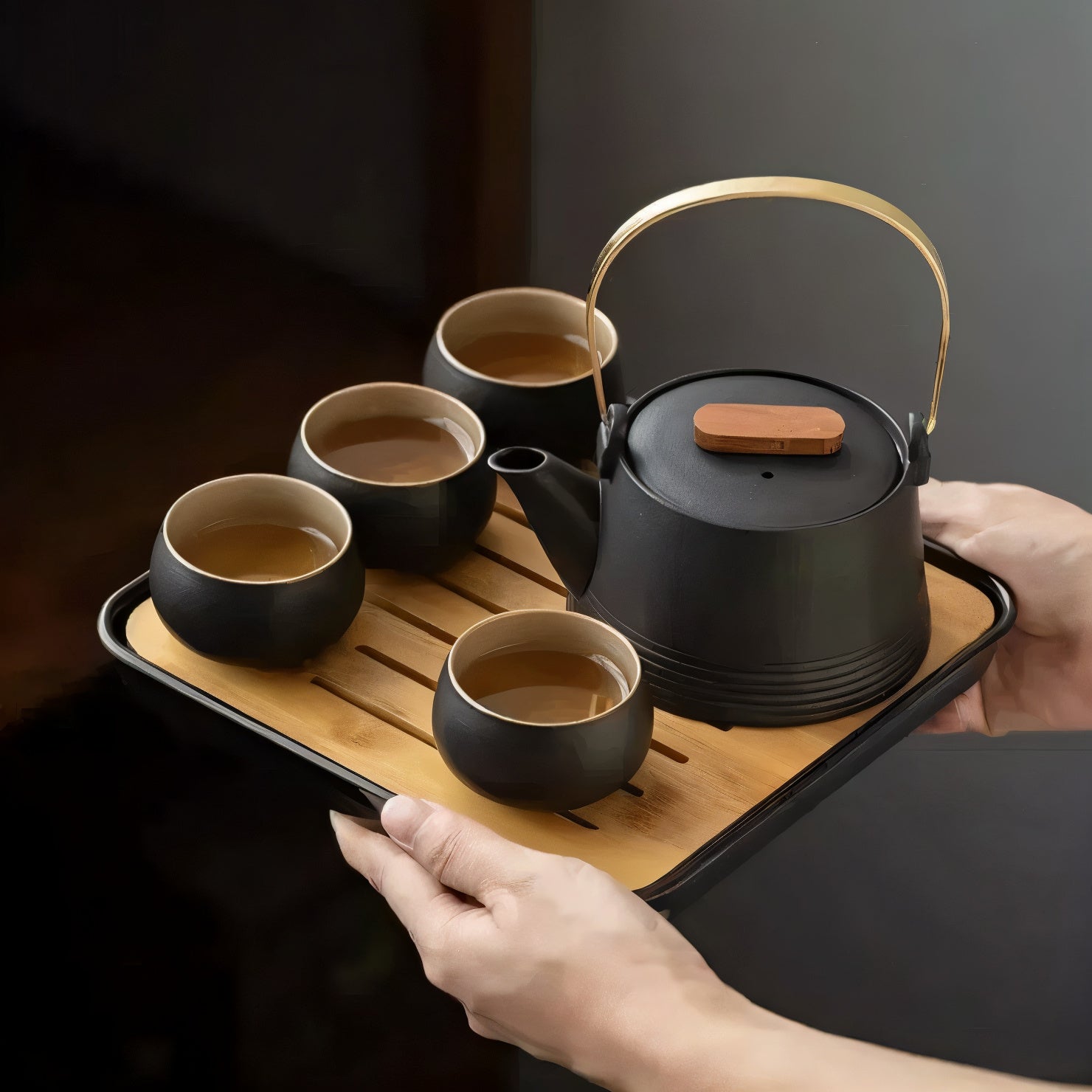Crafted for modern tea lovers, this Contemporary Stoneware 8-Piece Tea Set combines style, functionality, and sophistication. The set includes a sleek black teapot with a unique brass handle and wooden accents, a matching pitcher, and four complementary tea cups ? all sitting on a beautifully designed wooden tray. The stoneware?s matte finish offers a minimalist aesthetic that effortlessly blends traditional and contemporary design.